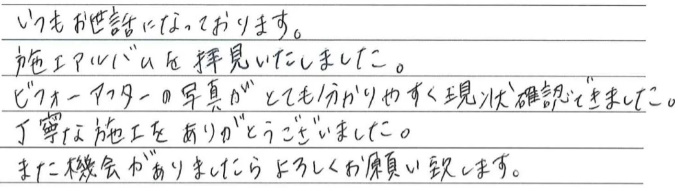 「いつもお世話になっております。施工アルバムを拝見いたしました。ビフォーアフターの写真がとても分かりやすく現状確認できました。丁寧な施工をありがとうございました。また機会がありましたらよろしくお願い致します。」