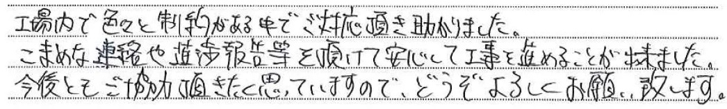 「工場内で色々と制約がある中でご対応頂き助かりました。こまめな連絡や進捗報告等を頂けて安心して工事を進めることが出来ました。今後ともご協力頂きたく思っていますので、どうぞよろしくお願い致します。」