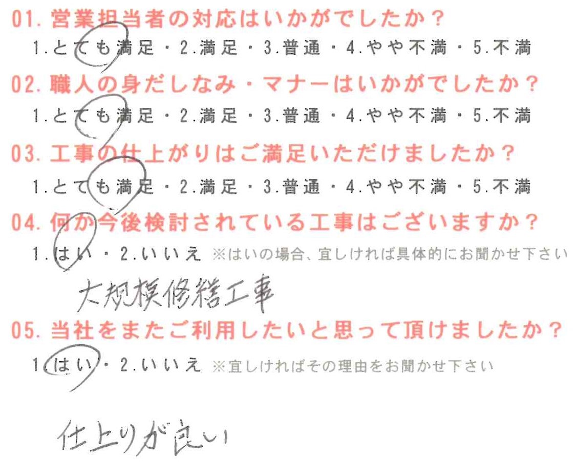 数年前にも屋上防水工事を弊社で施工させていただき、今回リピートという形で弊社を選んでいただきました。 ※掲載しているアンケートは数年前のものになります