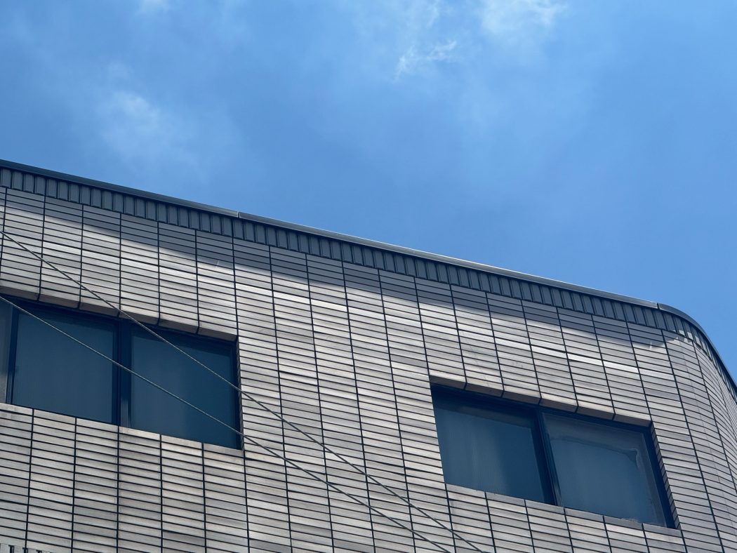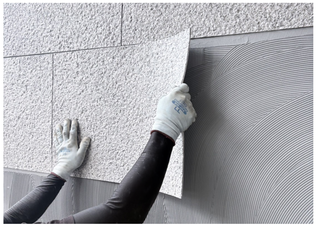 まるで本物の石のように見える建材シート山本窯業の“ユーネックス御影びしゃん”を外壁タイル全面に施工させていただきました。