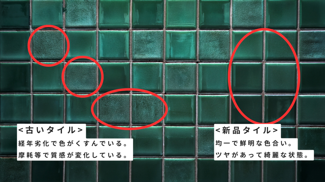 通常であれば、浮きや割れなど劣化しているタイルを貼り替えることが多いのですが、一部分だけ張り替えると既存の年数が経過したタイルと新品タイルで色味に差が出ます。