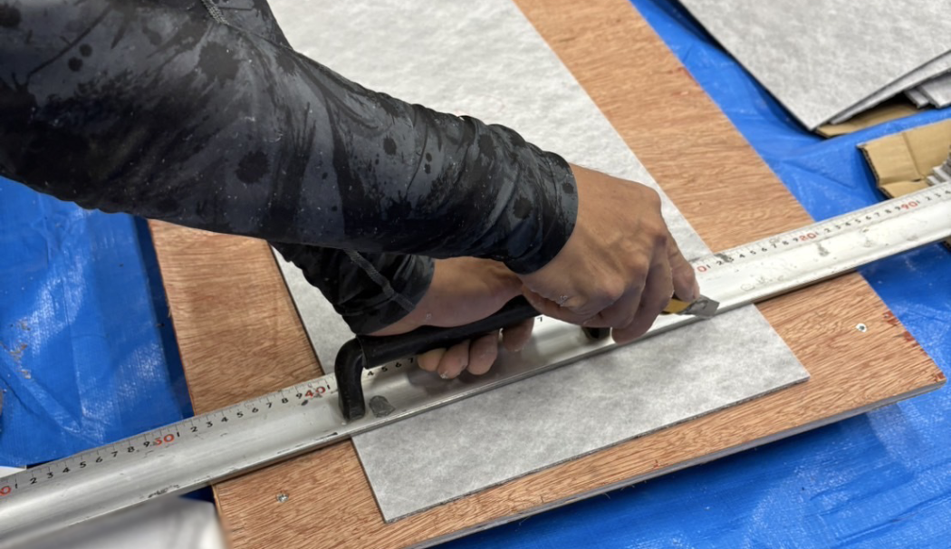 採寸したサイズに合わせ、建材シートをカットしていきます。