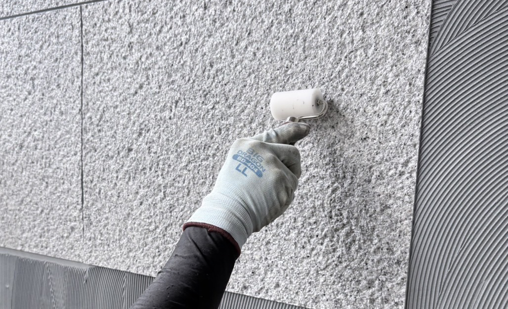 シート建材をタイル面の上から貼り付けることで、より広い面で外壁に密着することができ、タイルが剥がれ落ちるのを防止することができます。