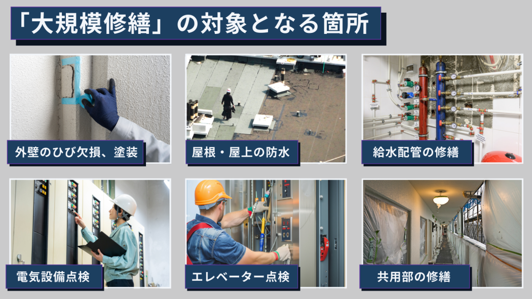 大規模修繕の対象となる箇所は多岐にわたります。具体的には、外壁、屋根・屋上、給排水管、電気設備、エレベーター、共用部の内装などが含まれます。これらの箇所は建物の劣化状況に応じて、補修や交換が行われます。劣化の進行度合いや、建物の構造、使用状況などによって、修繕の内容は異なります。